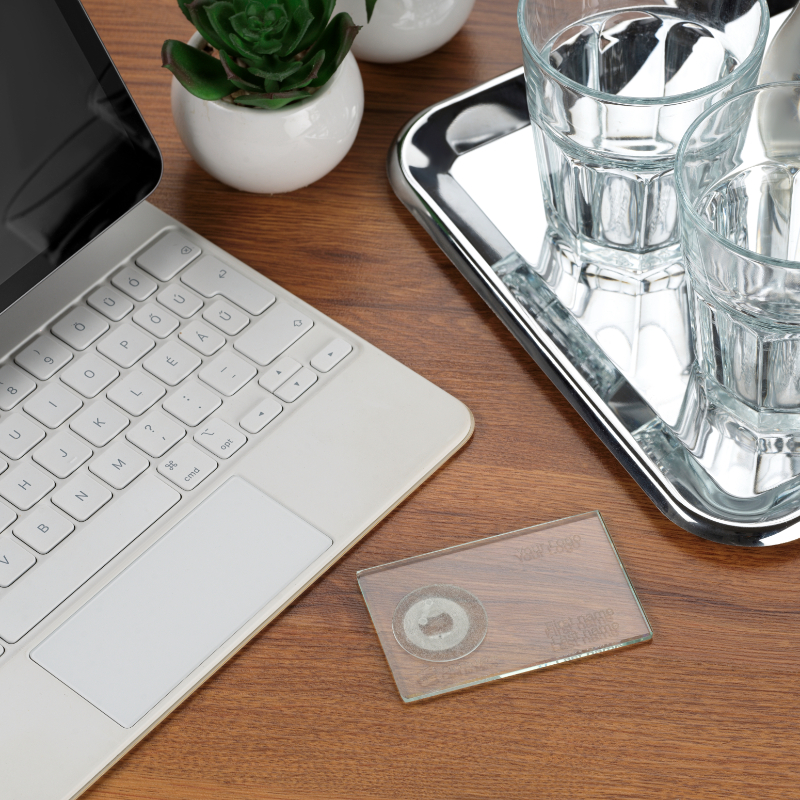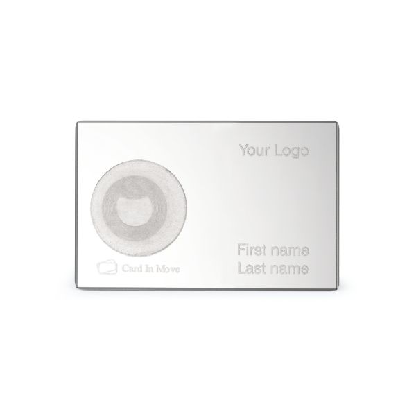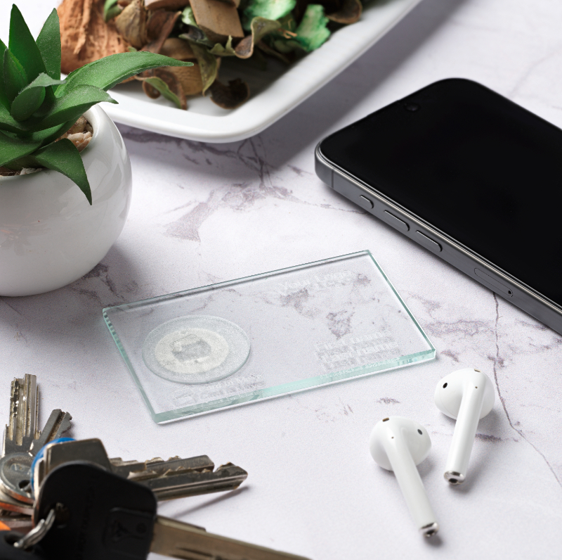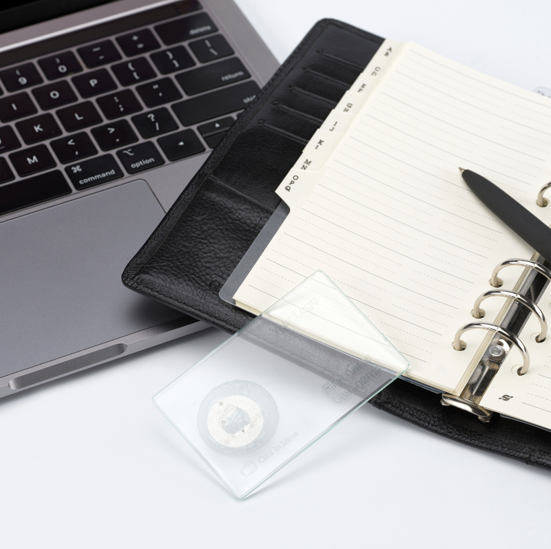 A CardInMove üvegből készült NFC névjegykártyája.